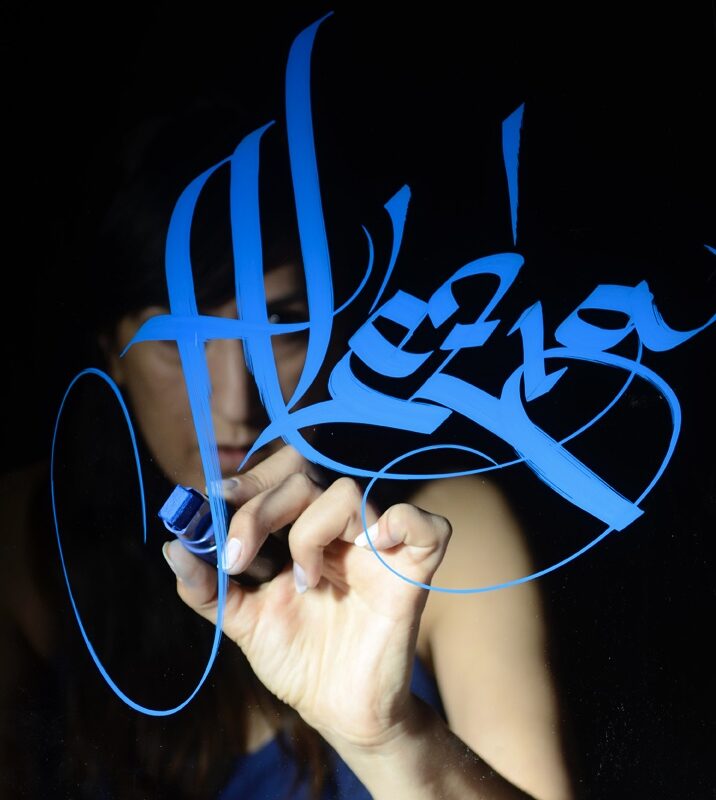 Sensible aux écritures urbaines, calligraphiques et typographiques, à la recherche d’un alphabet esthétisé à travers tags, lettres gothiques, représentations figuratives, éléments urbains, floraux, végétaux, elle aborde principalement la thématique du temps. Associées au graffiti, visuel stylisé de « ladies », mes calligraphies se font plus discrètes pour n’être souvent que signatures.